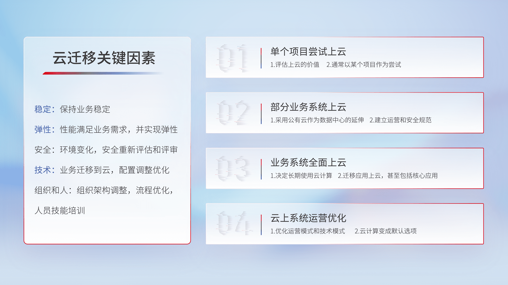 结合实际业务,,,从规划设计、、、、云平台选型、、云原生改造、、、、数据迁移、、、集成交付,,,,迁移全过程为客户识别最佳上云路径,,,做好风险识别管理,,,,设计网络架构、、、、身份权限、、、、安全审计合规、、、、操作审计、、日志审计、、监控告警策略、、、多站点容灾设计等,,,对云上基础设施进行整体规划,,,提升IT治理水平,,,,以满足弹性、、高可用、、、、高性能的需求。。。。