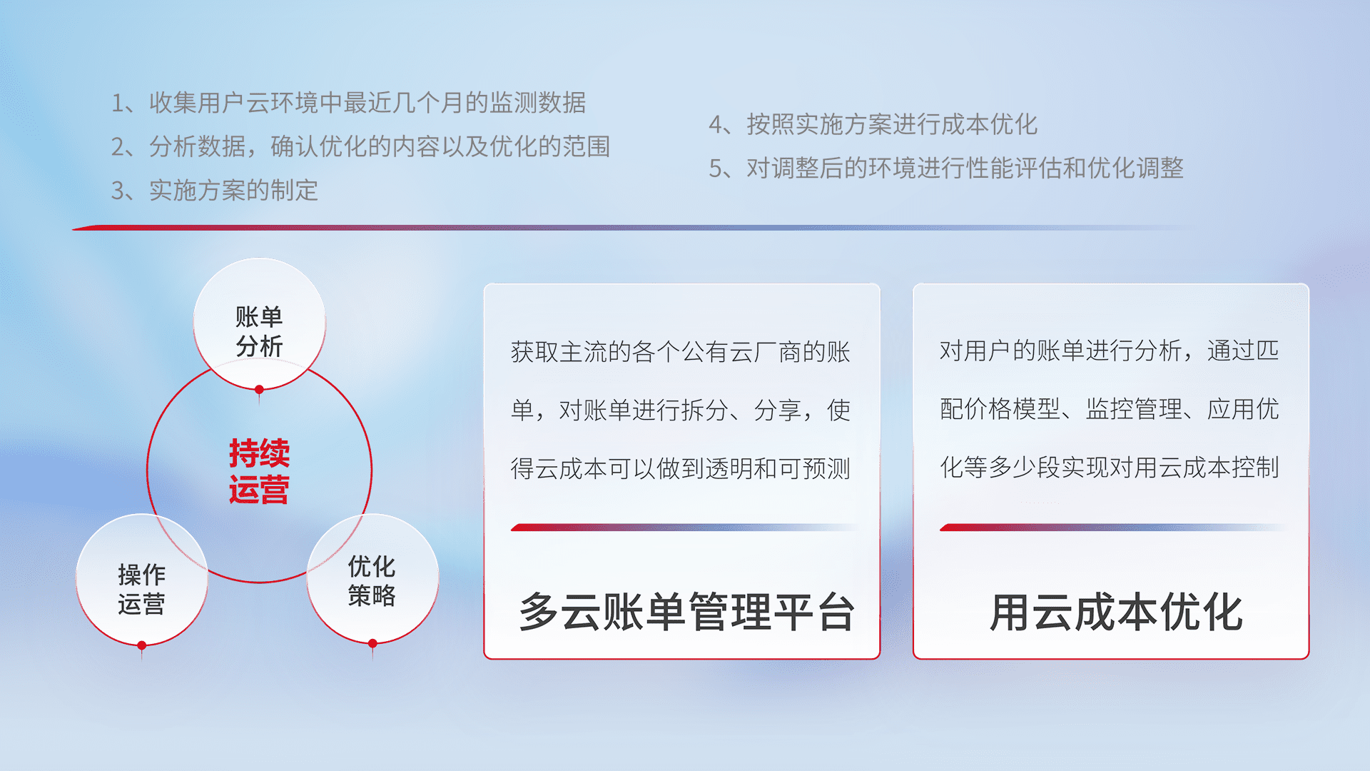 通过多云纳管,,,,以统一的资源数据模型把客户的云资源进行抽象和封装,,进而实现对多云资源的统一操作,,,保障云资源管理的可靠性、、、稳定性与可用性。。量身定制化运维内容,,配置、、、开发运维、、补丁管理、、备份、、监控、、、认证和访问管理、、、审计和日常巡检等,,保障在用云过程中的可靠度,,,稳定度以及高可用率。。。。